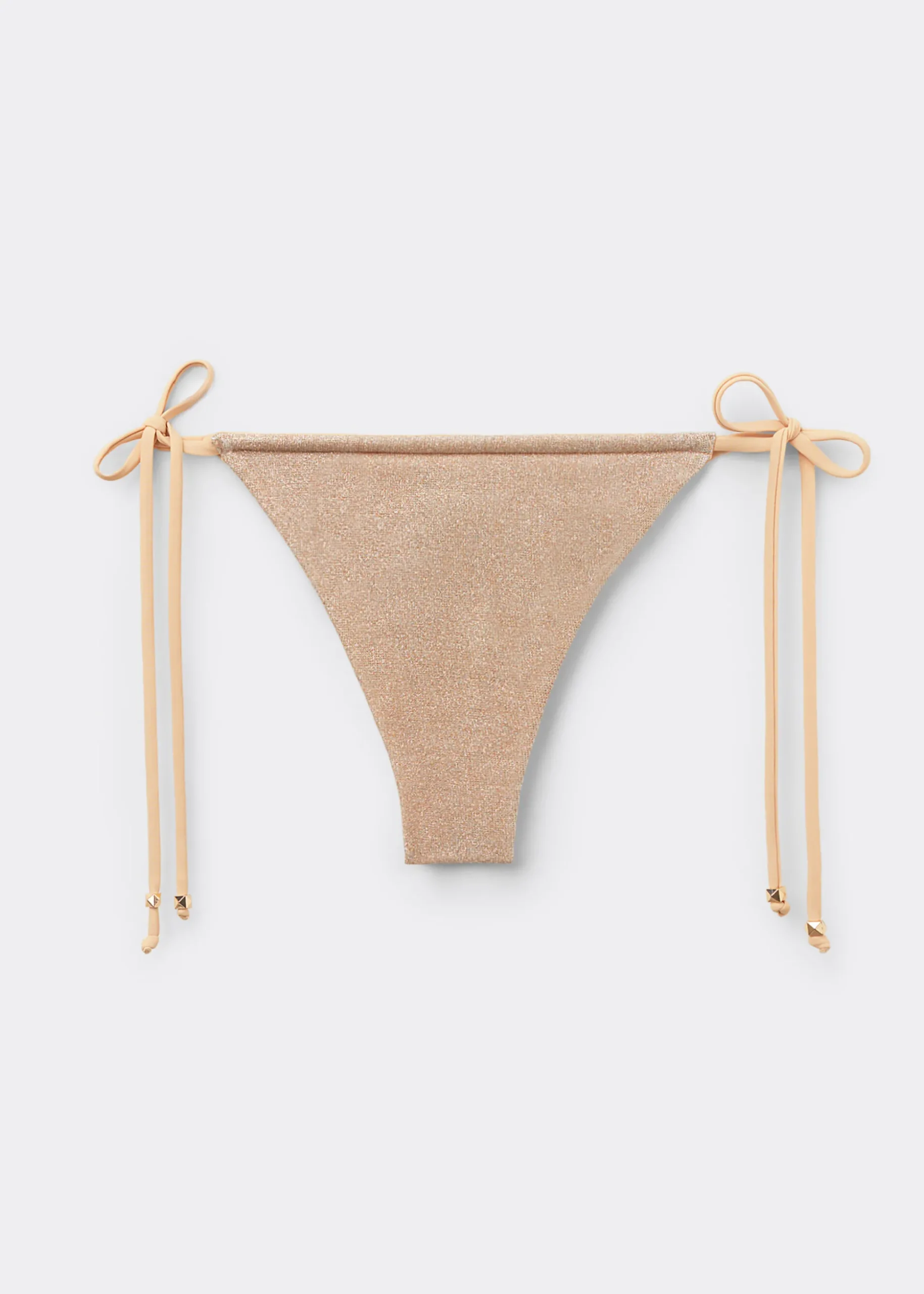 Brazyliany od bikini wiązane w biodrach na troczki umożliwiające wygodne dopasowanie. Lśniąca, brokatowa tkanina wyróżnia się wyrafinowanym połyskiem, który pozwoli stworzyć efektowny look. W całości wykończone podszewką. Tył z marszczeniem i szwem pośrodku dla większej wygody noszenia.