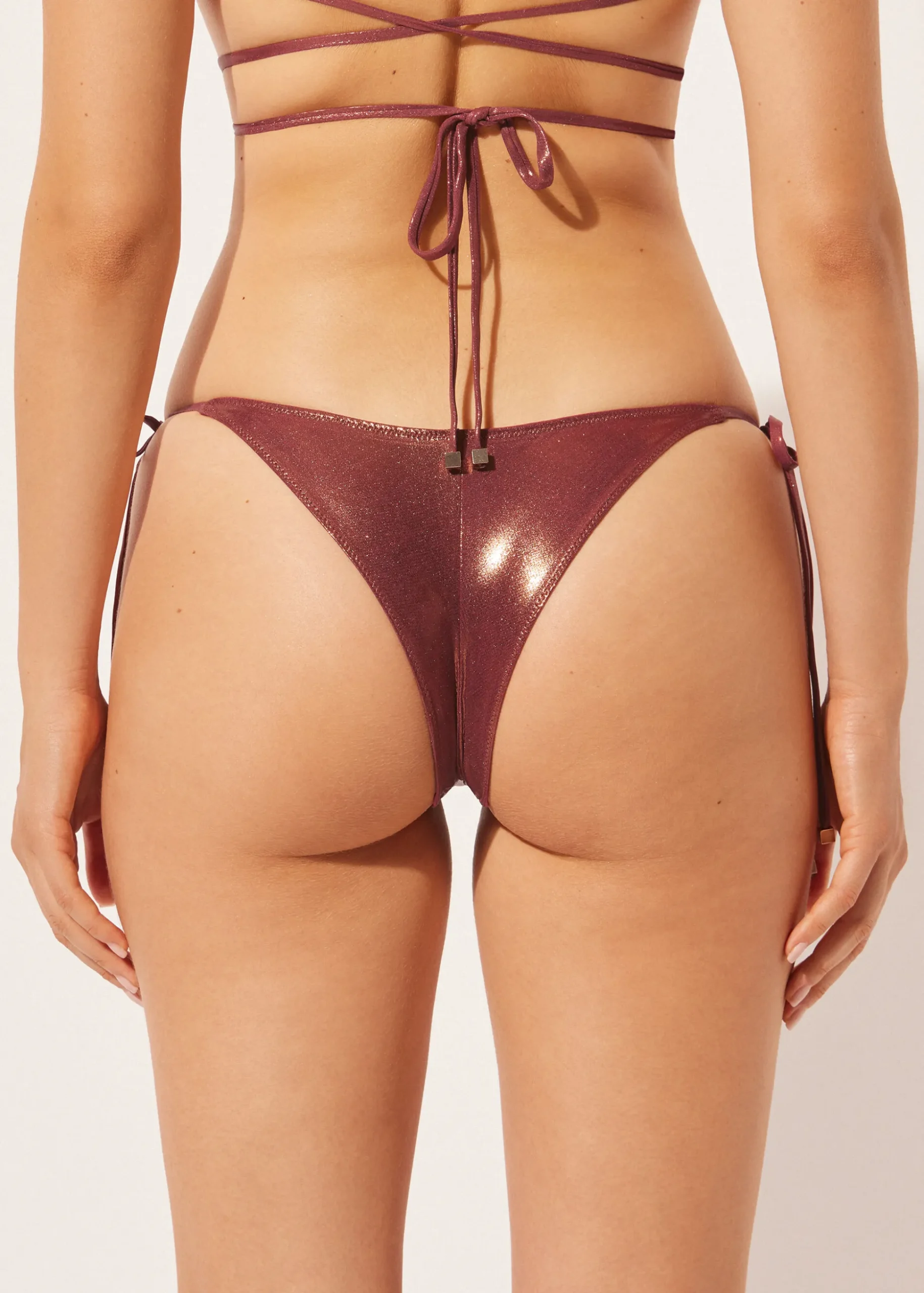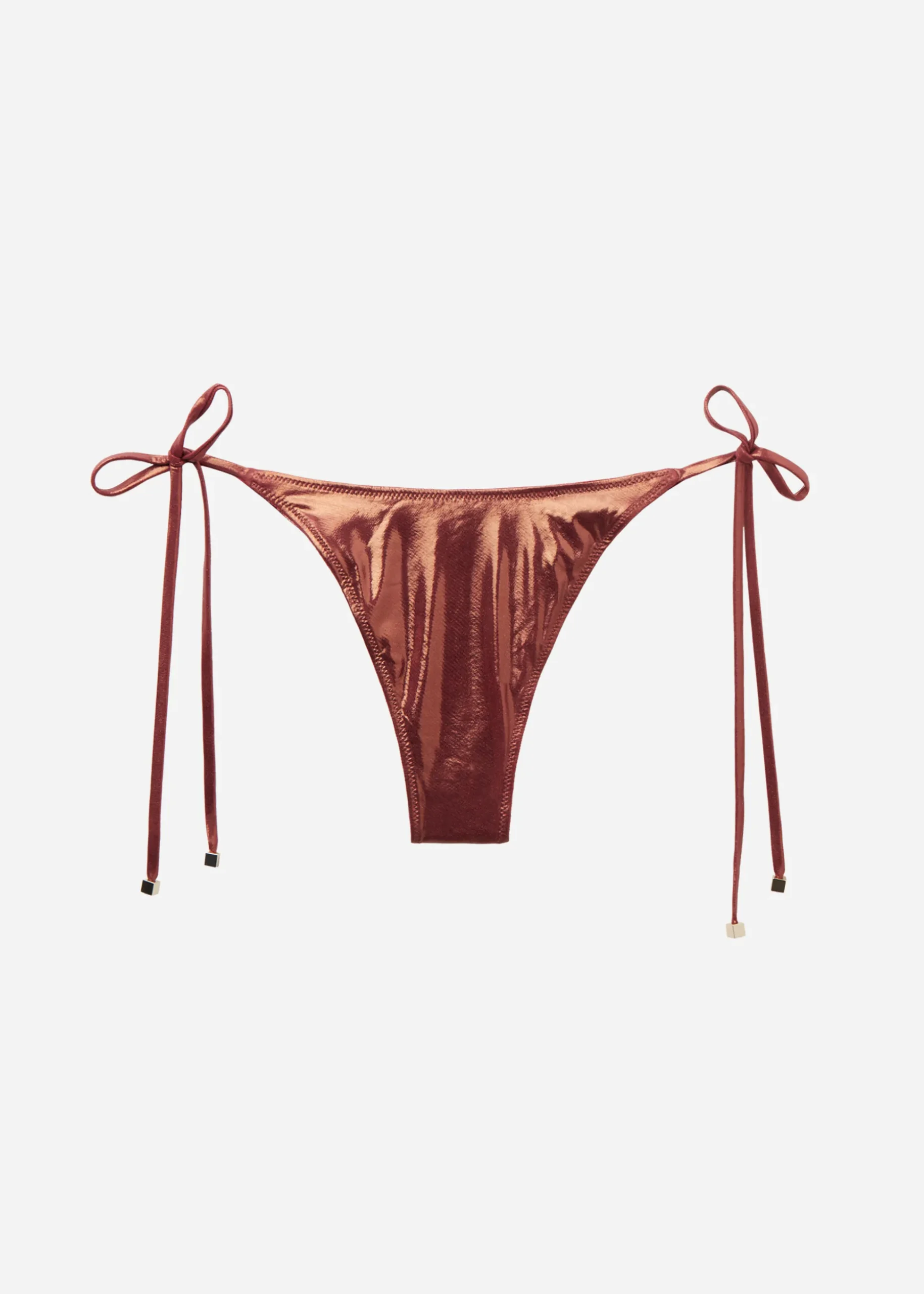 Brazyliany od kostiumu wiązane w biodrach na cienkie troczki umożliwiające wygodne dopasowanie. Model wyróżnia się niezwykle błyszczącą tkaniną z metalicznym efektem. Dzięki lekko zaokrąglonej talii z przodu można je nosić w tradycyjny sposób lub odsłonić biodra, w zależności od sylwetki. W całości wykończone podszewką i niewidocznymi szwami.