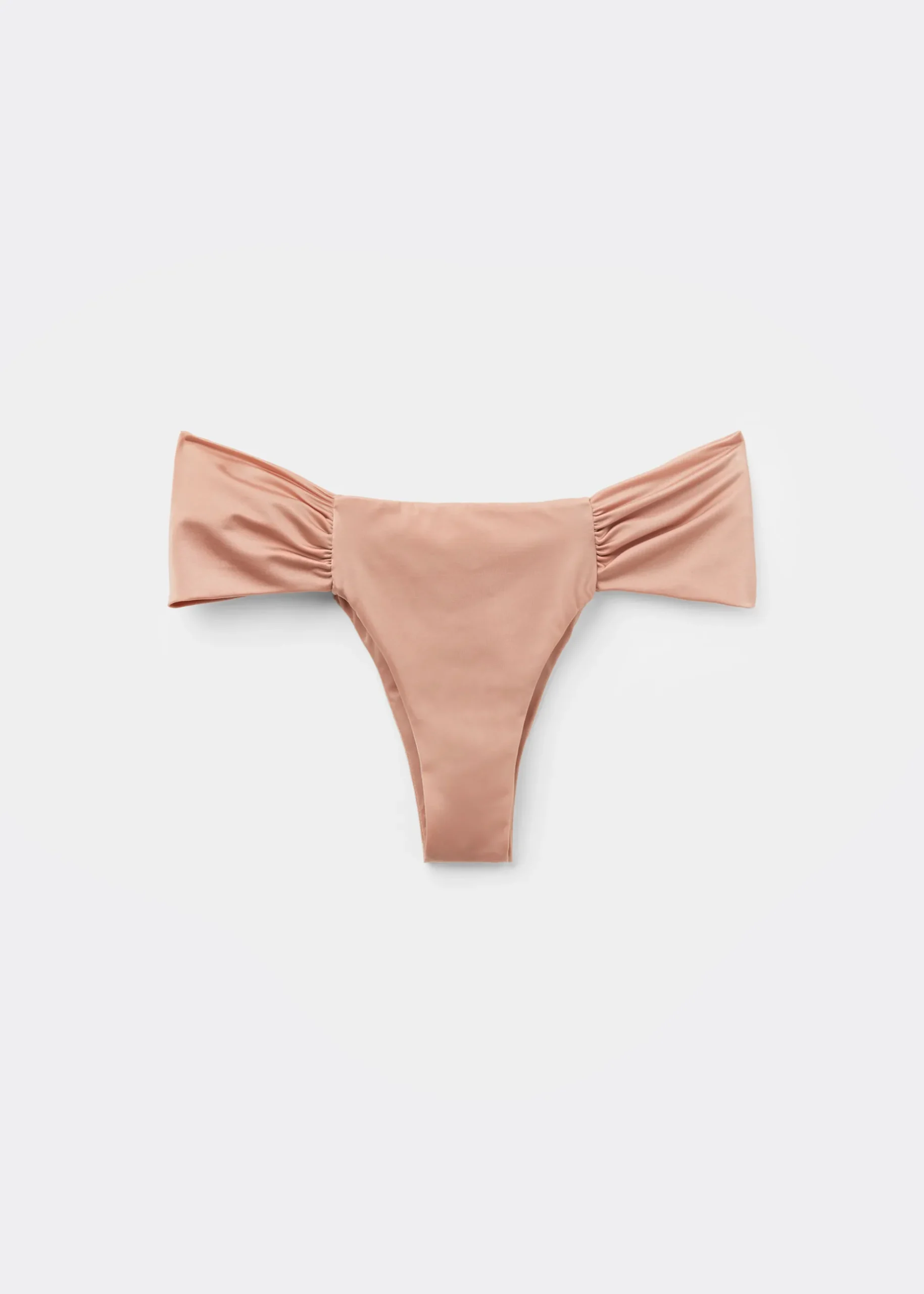 Brazyliany od kostiumu z marszczeniami materiału na biodrach, które umożliwiają dopasowanie na odpowiedniej wysokości. Model wyróżnia się błyszczącą i niezwykle miękką w dotyku tkaniną z efektem jedwabiu. W całości podszyte podszewką i wykończone niewidocznymi szwami.