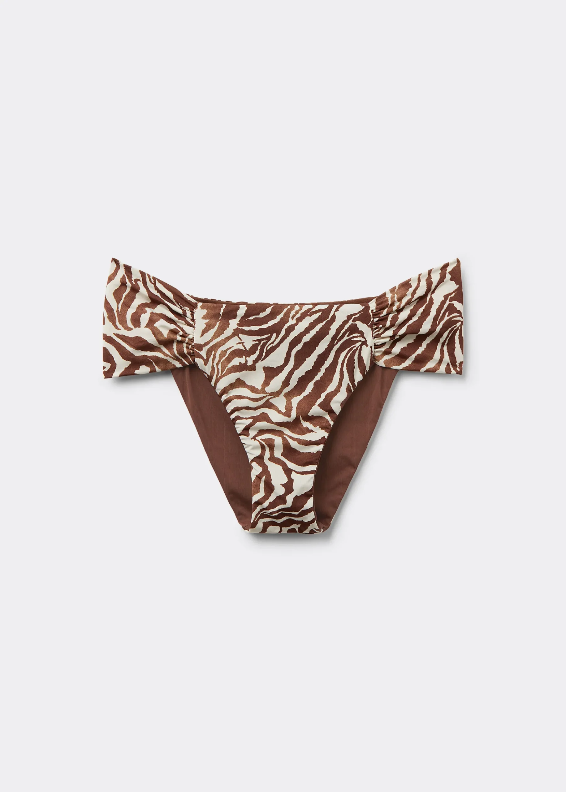 Figi od bikini z marszczeniem na biodrach, które umożliwia dopasowanie na odpowiedniej wysokości. Model wyróżnia się wyrafinowanym wzorem w zebrę. W całości wykończone podszewką i niewidocznymi szwami.