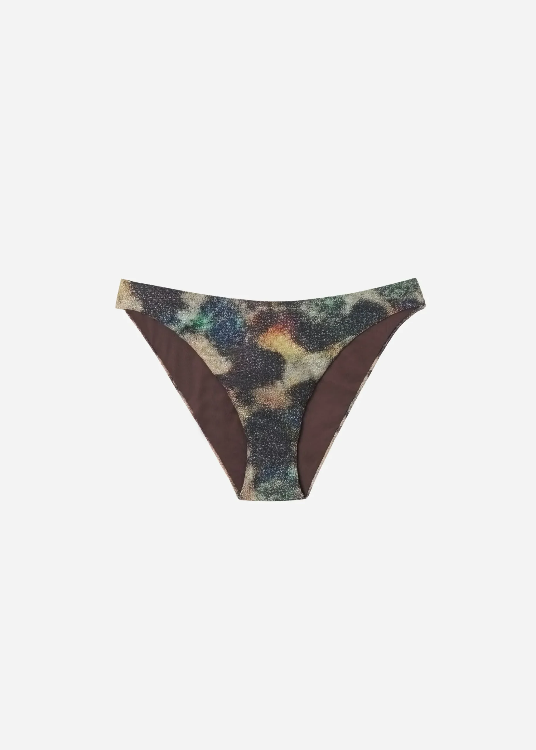 Figi od kostiumu w całości podszyte podszewką i wykończone niewidocznymi szwami. Dzięki lekko zaokrąglonej talii z przodu można je nosić w tradycyjny sposób lub odsłonić biodra, w zależności od sylwetki. Charakterystyczna błyszcząca tkanina ze wzorem moro.