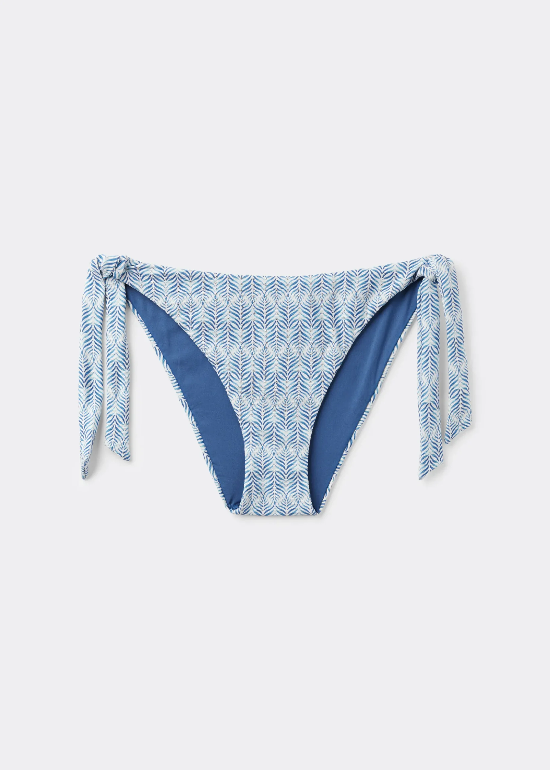 Figi od bikini wiązane w biodrach na kokardy umożliwiające wygodne dopasowanie. Wyszukany geometryczny wzór w delikatnych odcieniach bieli i błękitu, ozdobiony mikroperełkami, dodaje elegancji i wyrafinowania. Delikatnie zaokrąglona talia, oprócz standardowego sposobu noszenia, pozwala na efektowne odsłonięcie bioder i podkreślenie sylwetki. W całości wykończone podszewką z niewidocznymi szwami.