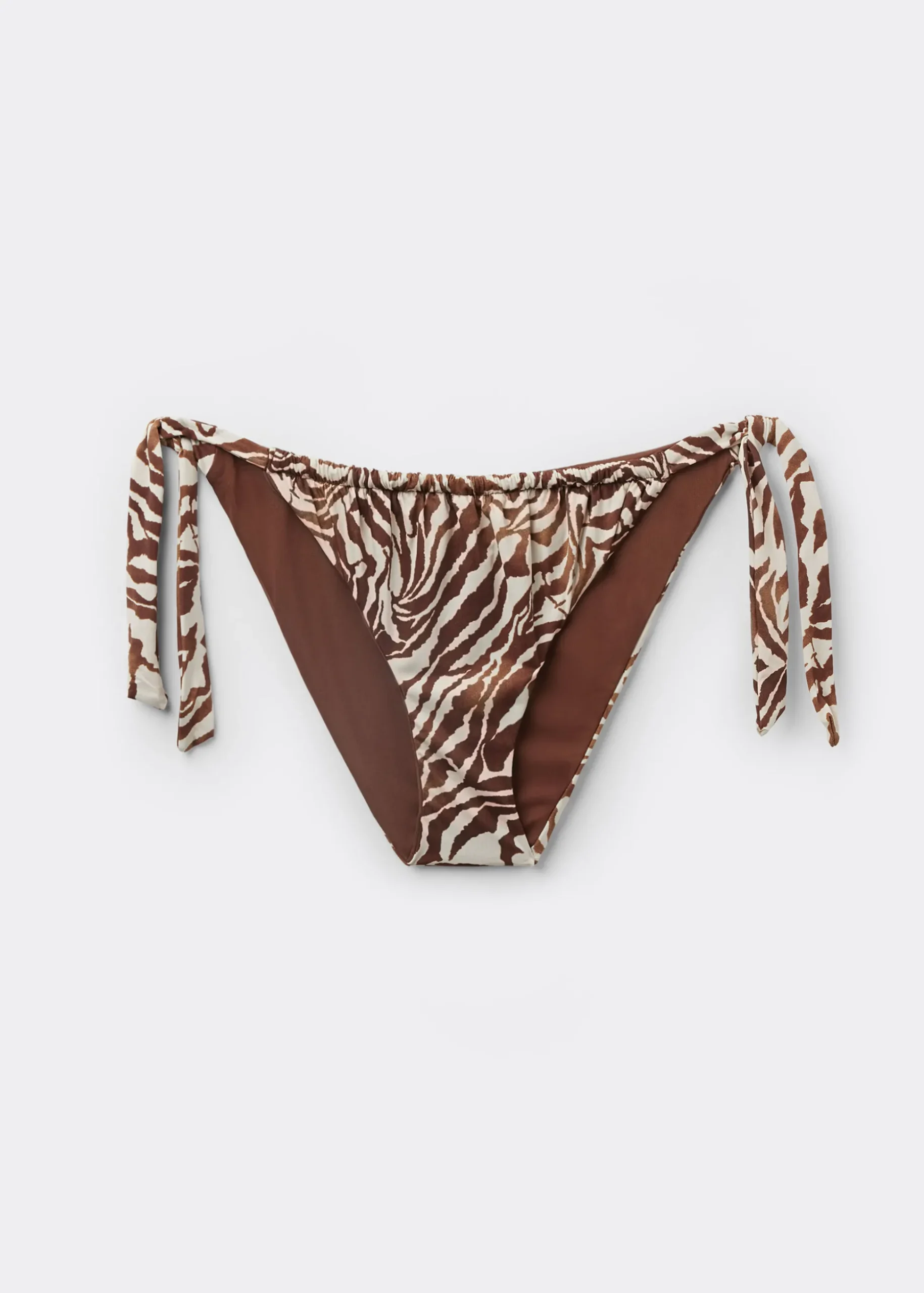 Figi od bikini wiązane w biodrach na kokardy umożliwiające wygodne dopasowanie. Model wyróżnia się wyrafinowanym wzorem w zebrę. W całości wykończone podszewką i niewidocznymi szwami.