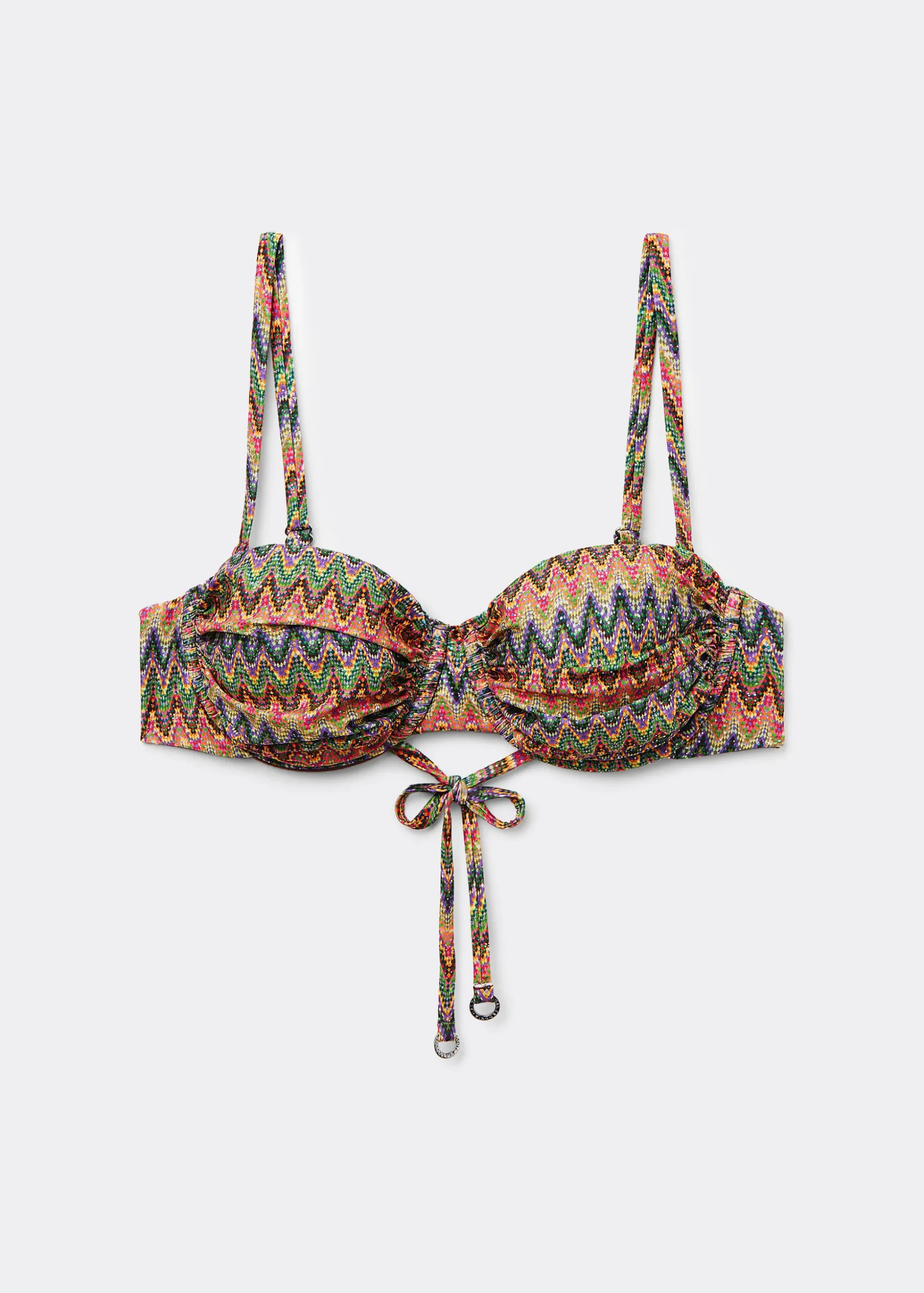 Góra od bikini o kroju opaski z lekko usztywnianymi miseczkami. Fiszbiny boczne doskonale podtrzymują biust. Zygzakowy wzór w różnych intensywnych kolorach nadaje wesoły i dynamiczny charakter idealny na lato. Odpinane ramiączka z regulacją długości. Z tyłu wiązanie na kokardę.