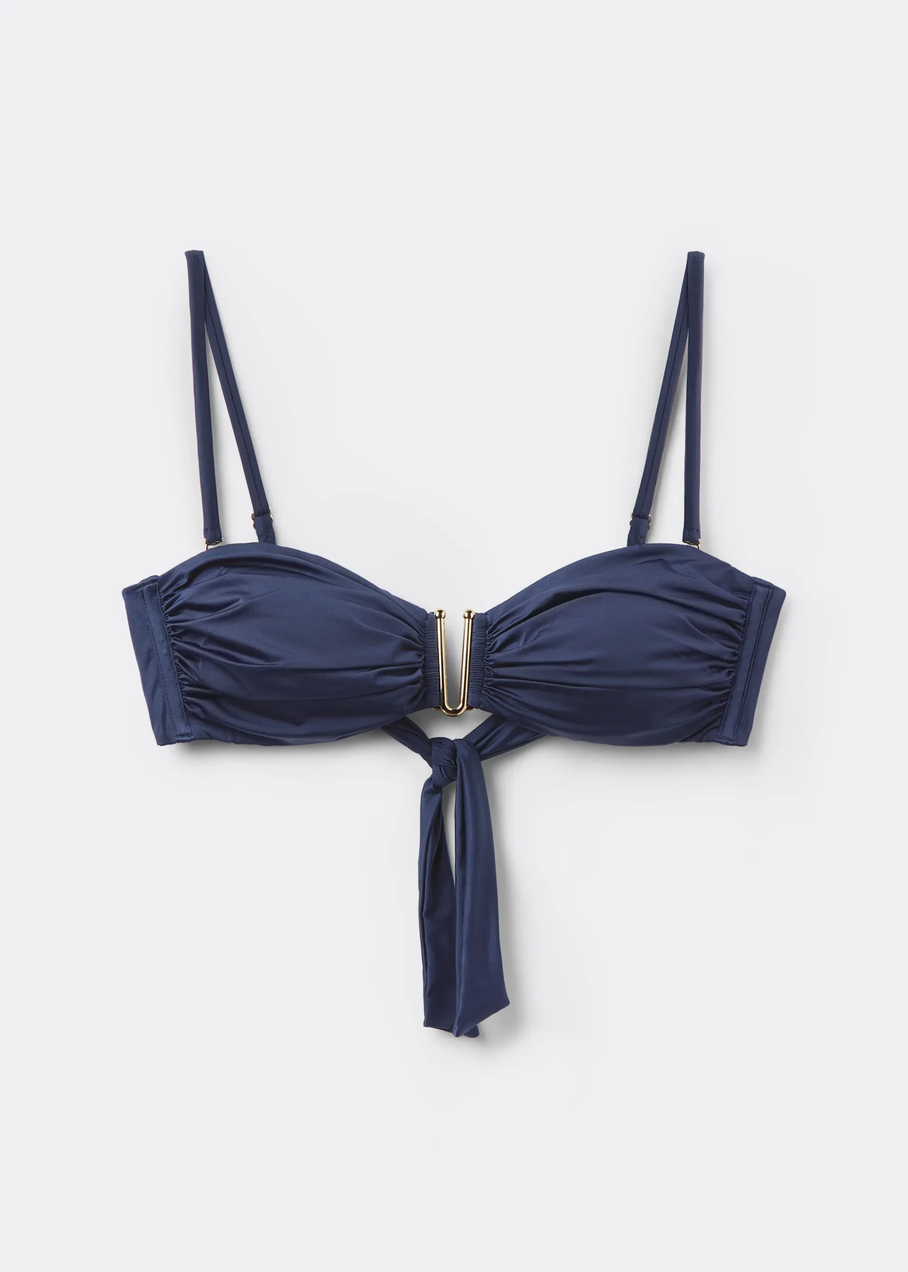 Góra od kostiumu o kroju opaski z lekko usztywnianymi miseczkami. Fiszbiny boczne doskonale podtrzymują biust. Model wyróżnia się błyszczącą tkaniną i złotym detalem między miseczkami. Odpinane ramiączka z regulacją długości. Z tyłu wiązanie na kokardę.