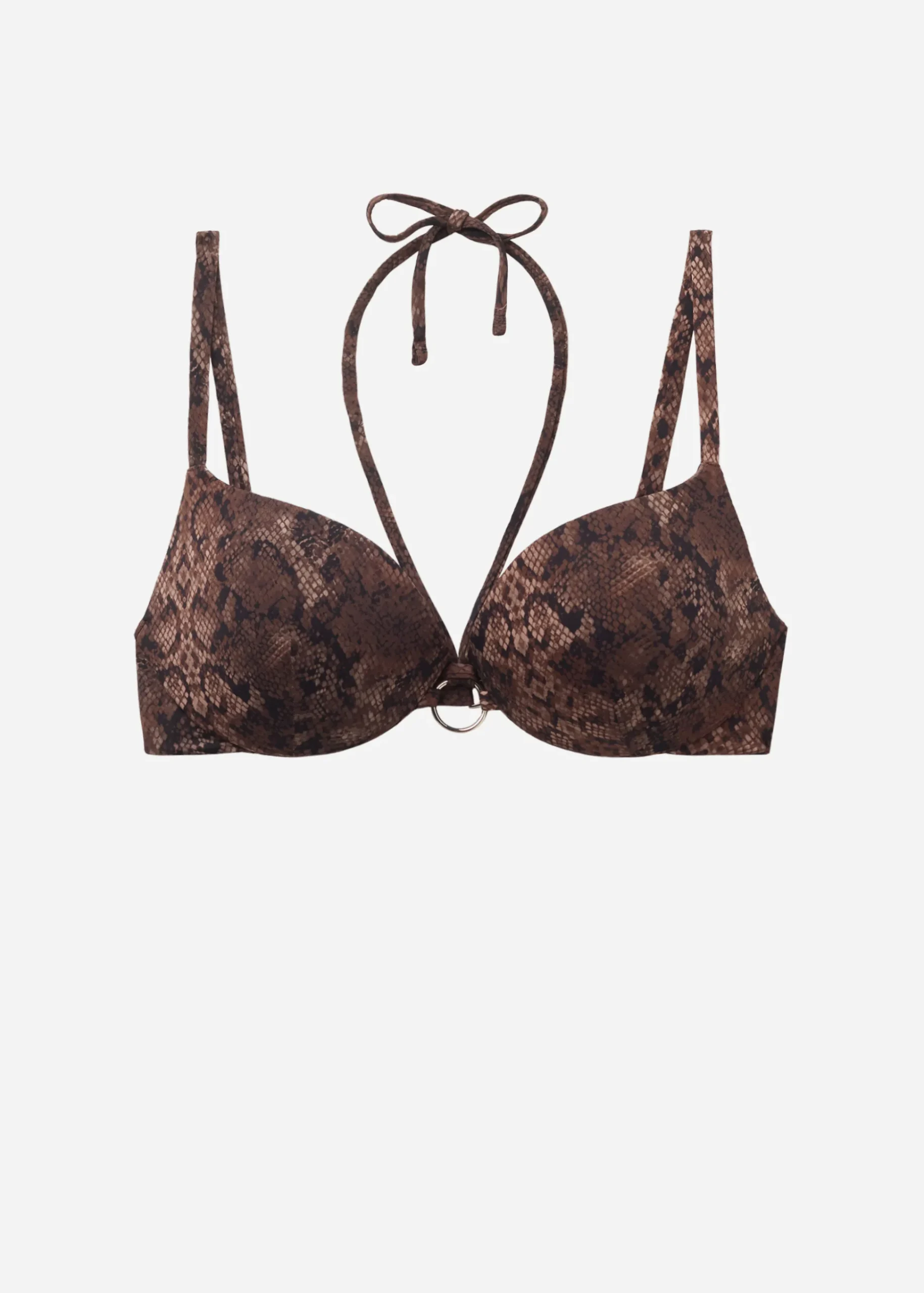 Góra od bikini z usztywnianymi miseczkami push-up na fiszbinach, z niezwykle miękkim stopniowanym wypełnieniem. Model wyróżnia się wyszukanym zwierzęcym wzorem w ciemnobrązowym kolorze oraz zdejmowanymi sznurkami wiązanymi pomiędzy miseczkami, które nadają mu modny i nowoczesny charakter. Regulowane ramiączka i zapięcie z tyłu na haczyk z podwójną regulacją.