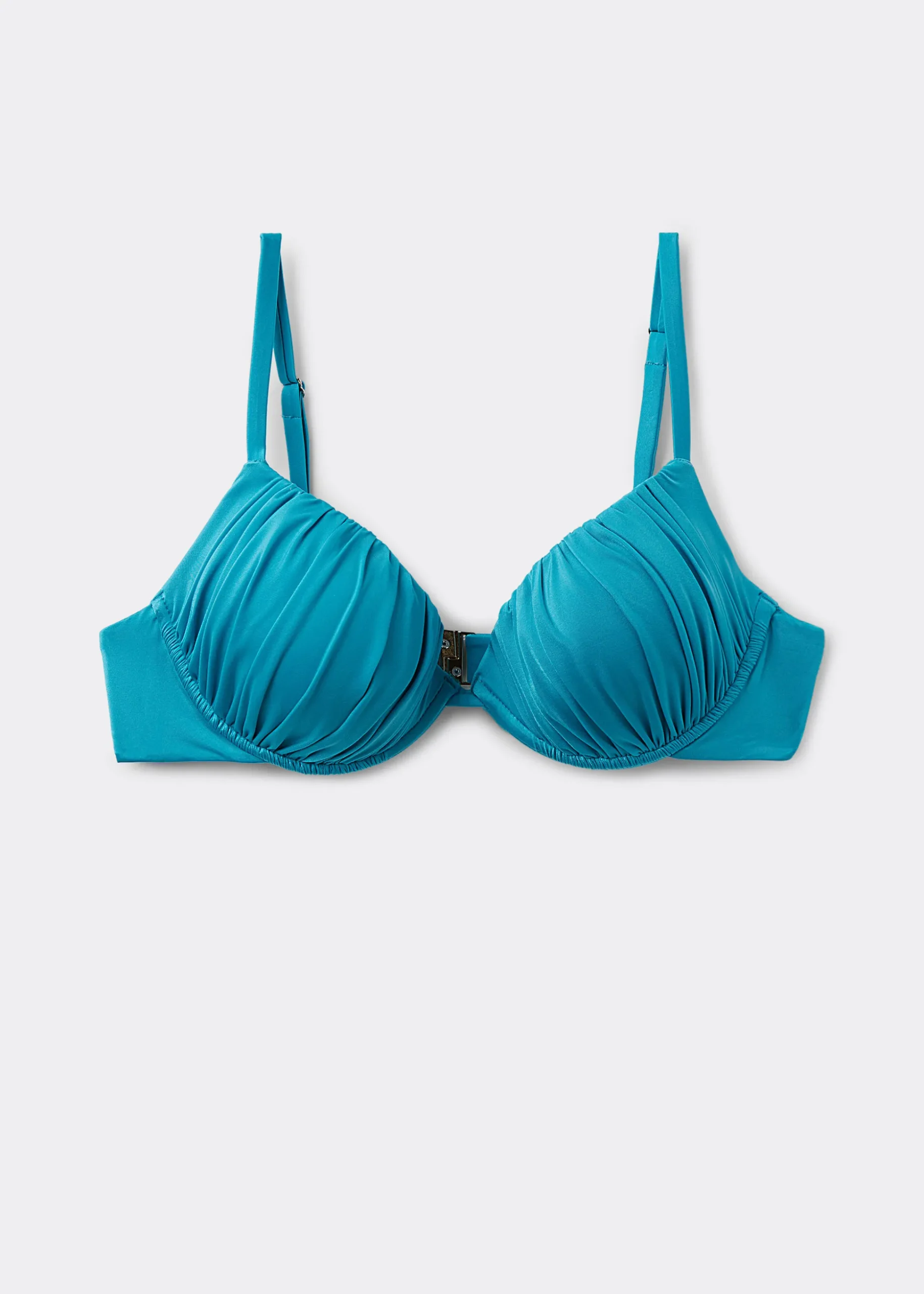 Góra od bikini z lekko usztywnianymi miseczkami push-up i fiszbinami zapewniającymi lepsze podtrzymanie biustu i większy efekt objętości. Model wyróżnia się błyszczącą tkaniną z efektem jedwabiu. Odpinane z tyłu ramiączka można zawiązać na karku lub skrzyżować na plecach. Zapięcie z tyłu na haczyk z podwójną regulacją.
