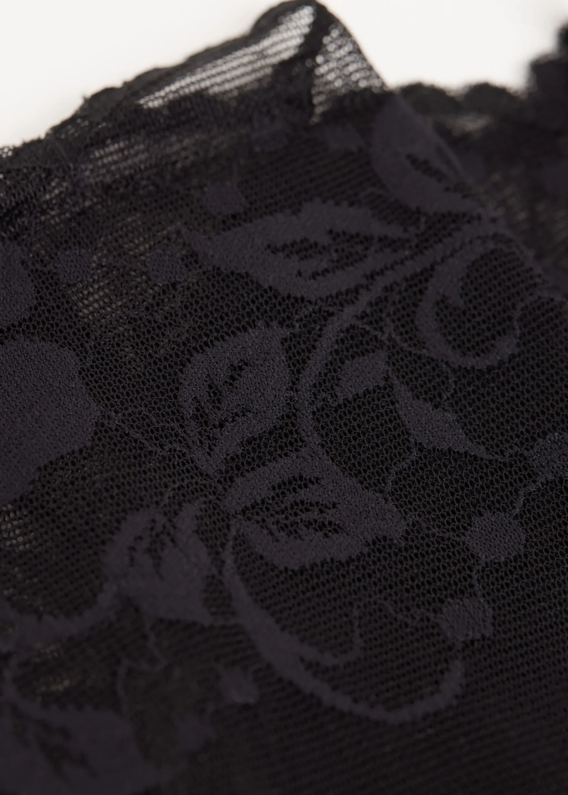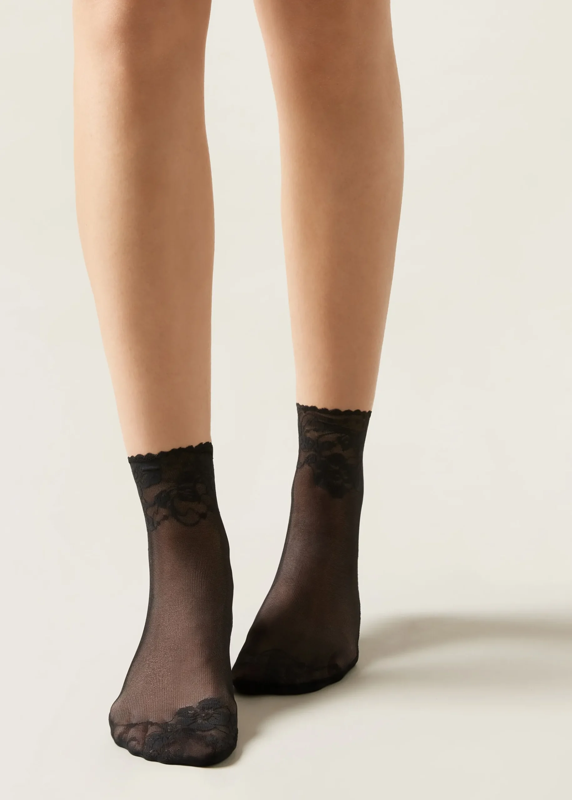 Krótkie damskie skarpety z tiulowej tkaniny ozdobione koronkowym kwiatowym motywem. Pofalowany ściągacz i bawełniana stopa.