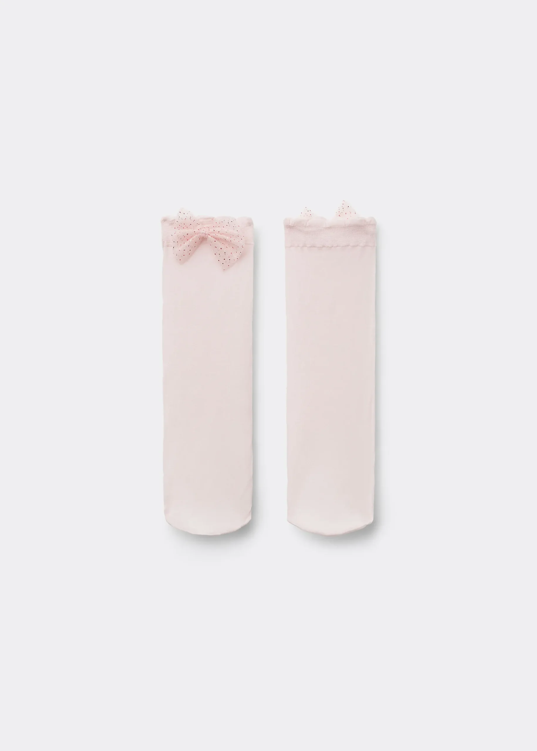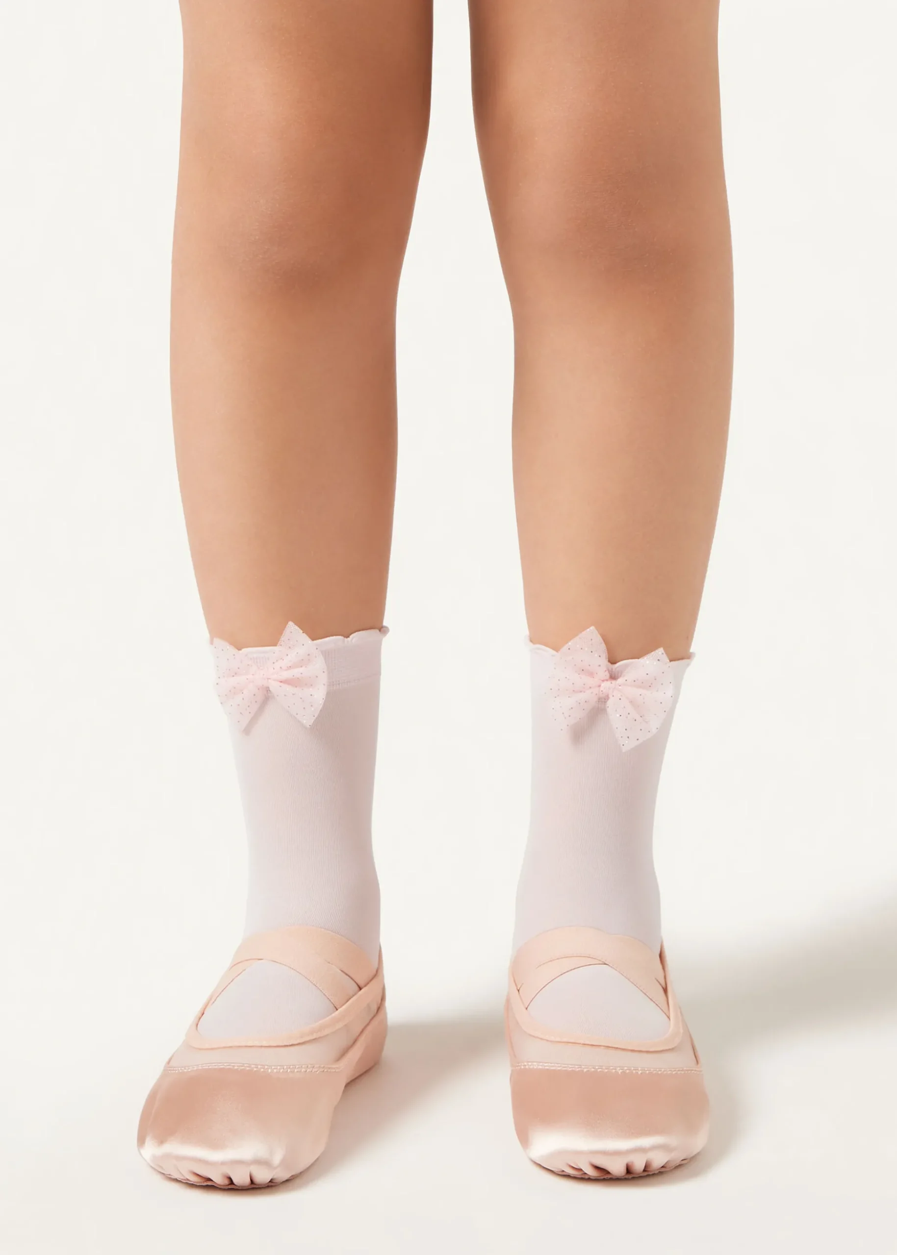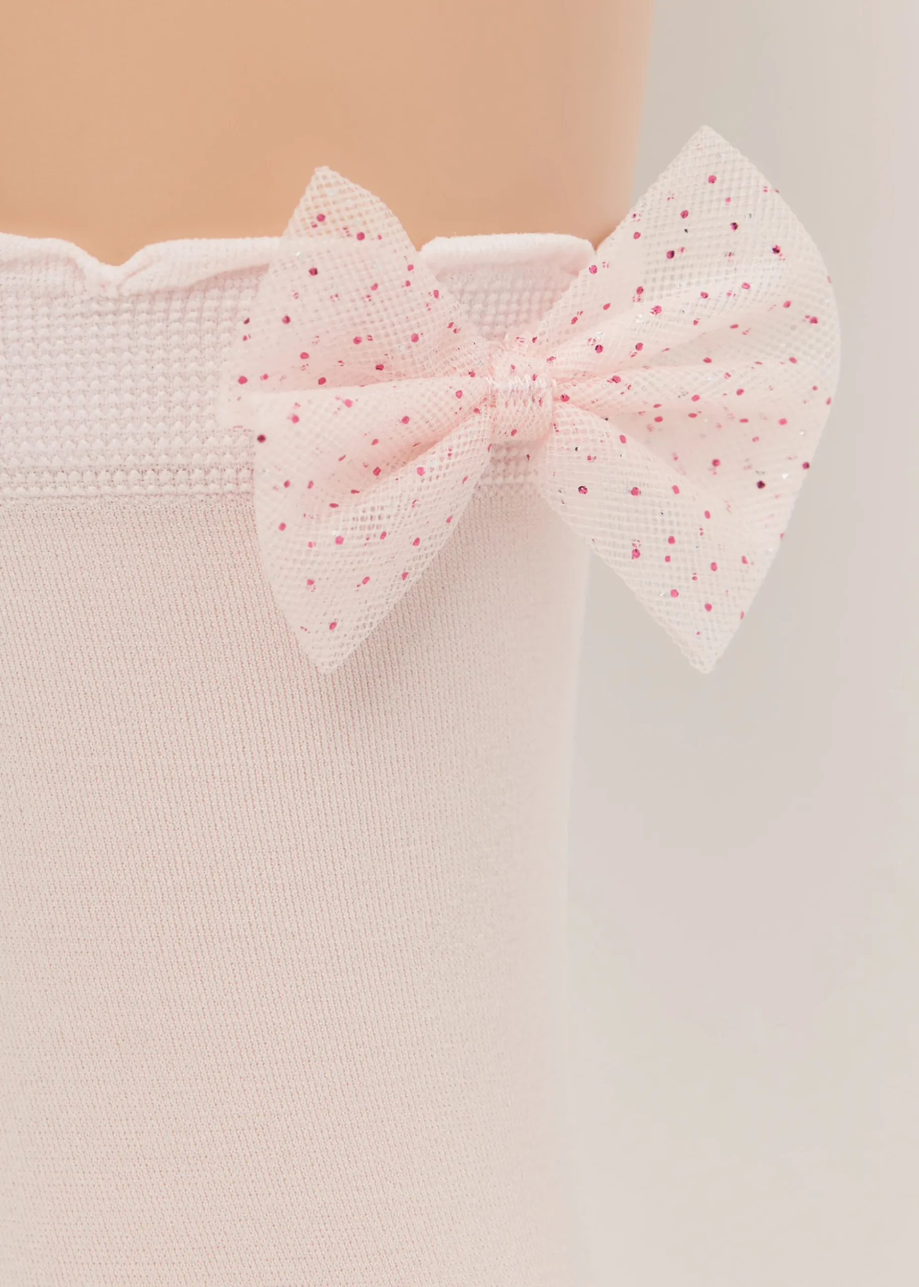 Krótkie skarpety dziewczęce z mikrofibry 30 den z pofalowanym ściągaczem, ozdobione elegancką tiulowo-brokatową kokardką.