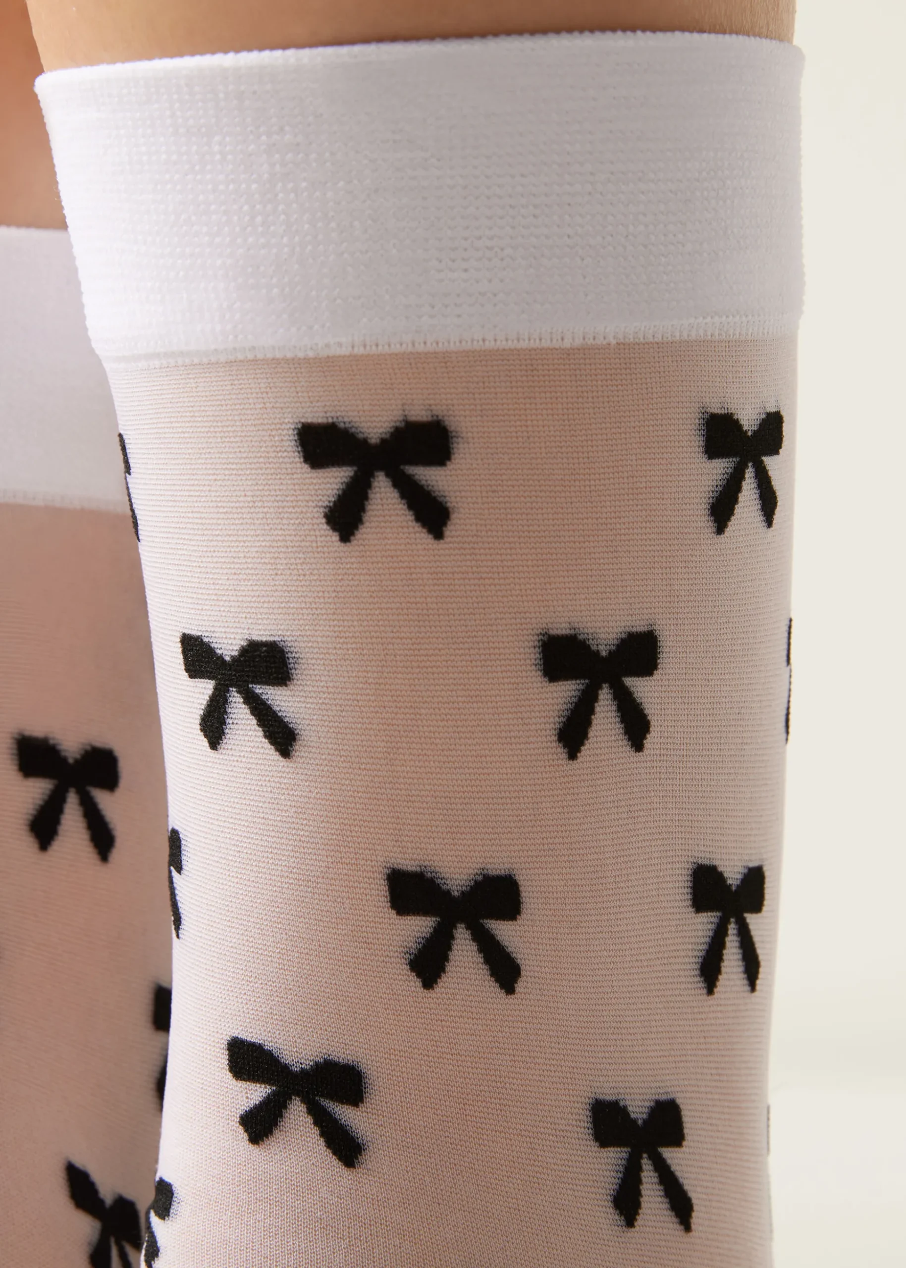Cienkie krótkie skarpety damskie 15 den z kokardkami na całej powierzchni, wykończone gładkim ściągaczem.