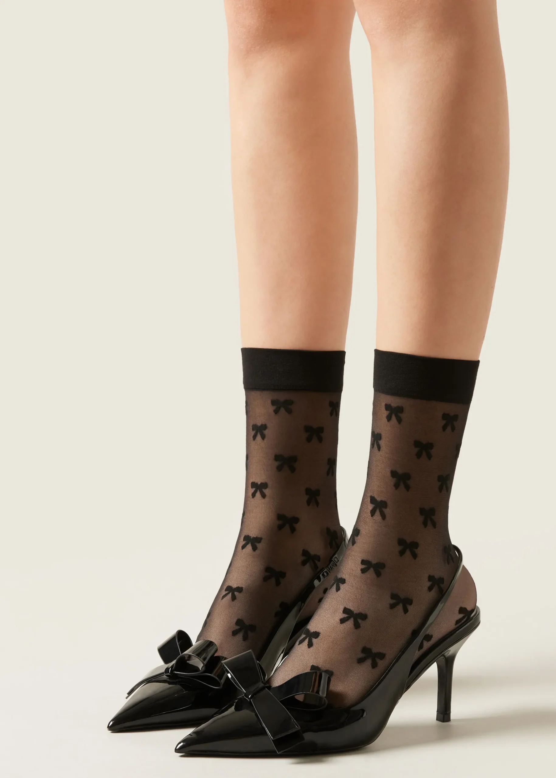 Cienkie krótkie skarpety damskie 15 den z kokardkami na całej powierzchni, wykończone gładkim ściągaczem.