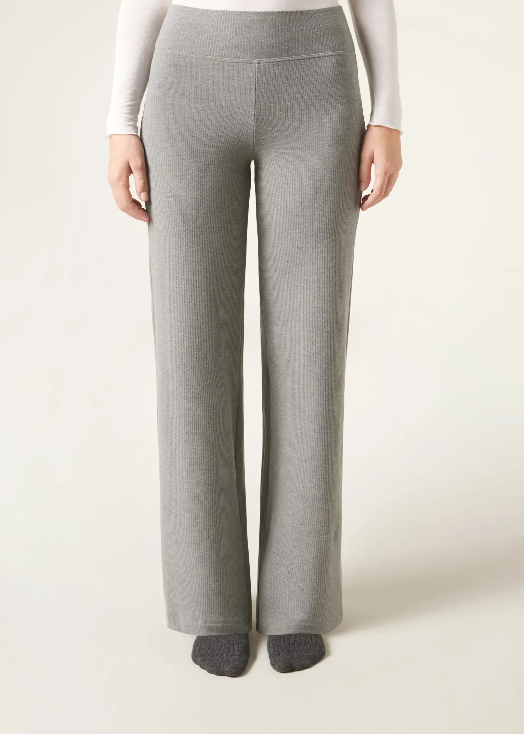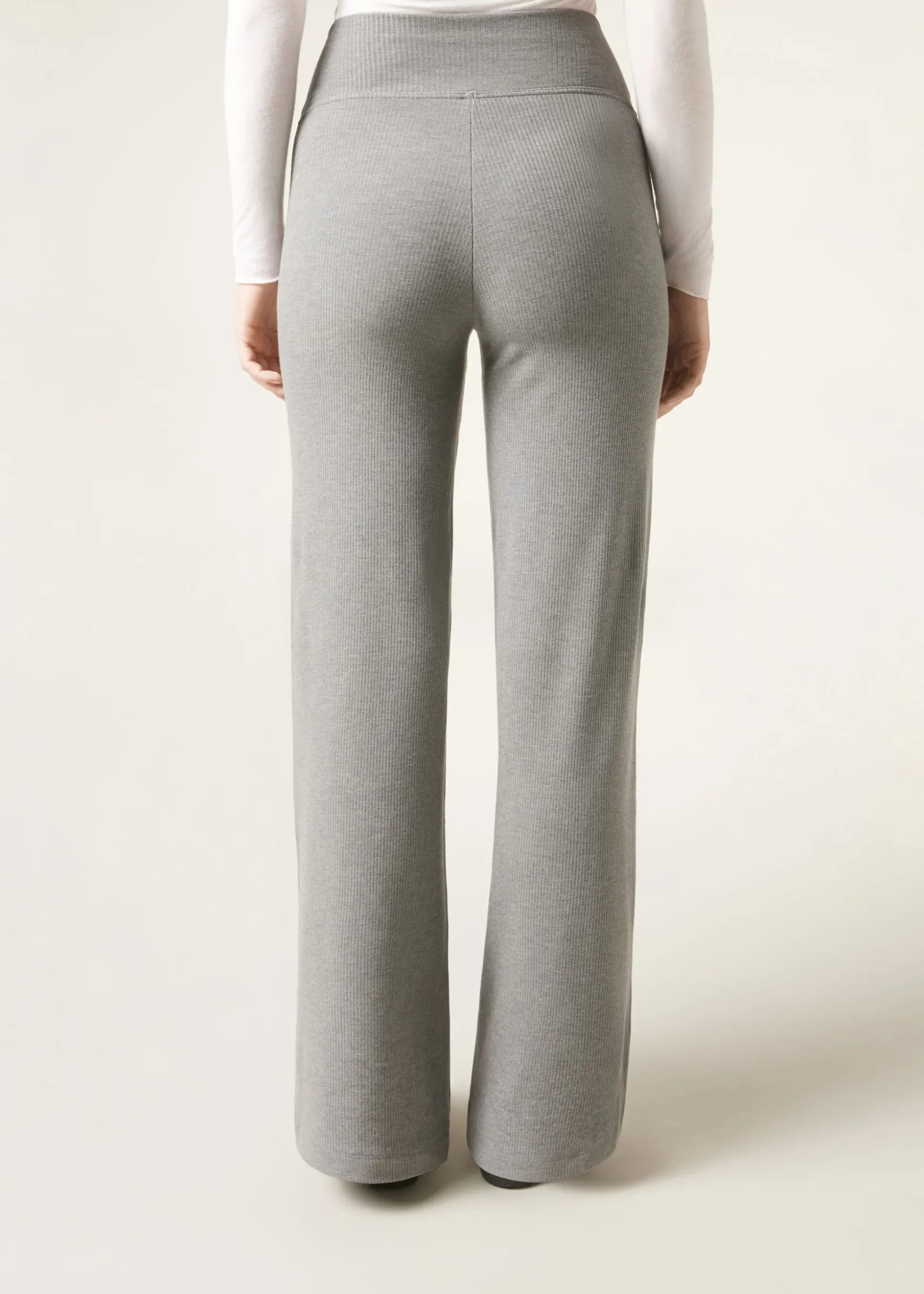 Damskie spodnie o kroju palazzo z prążkowanego modalu z domieszką kaszmiru, wykończone szerokim i wygodnym pasem bez gumki. Kryjąca, miękka i oddychająca tkanina z ciepłym meszkiem wewnątrz, idealnie łącząca w sobie styl i komfort na najchłodniejsze dni.
