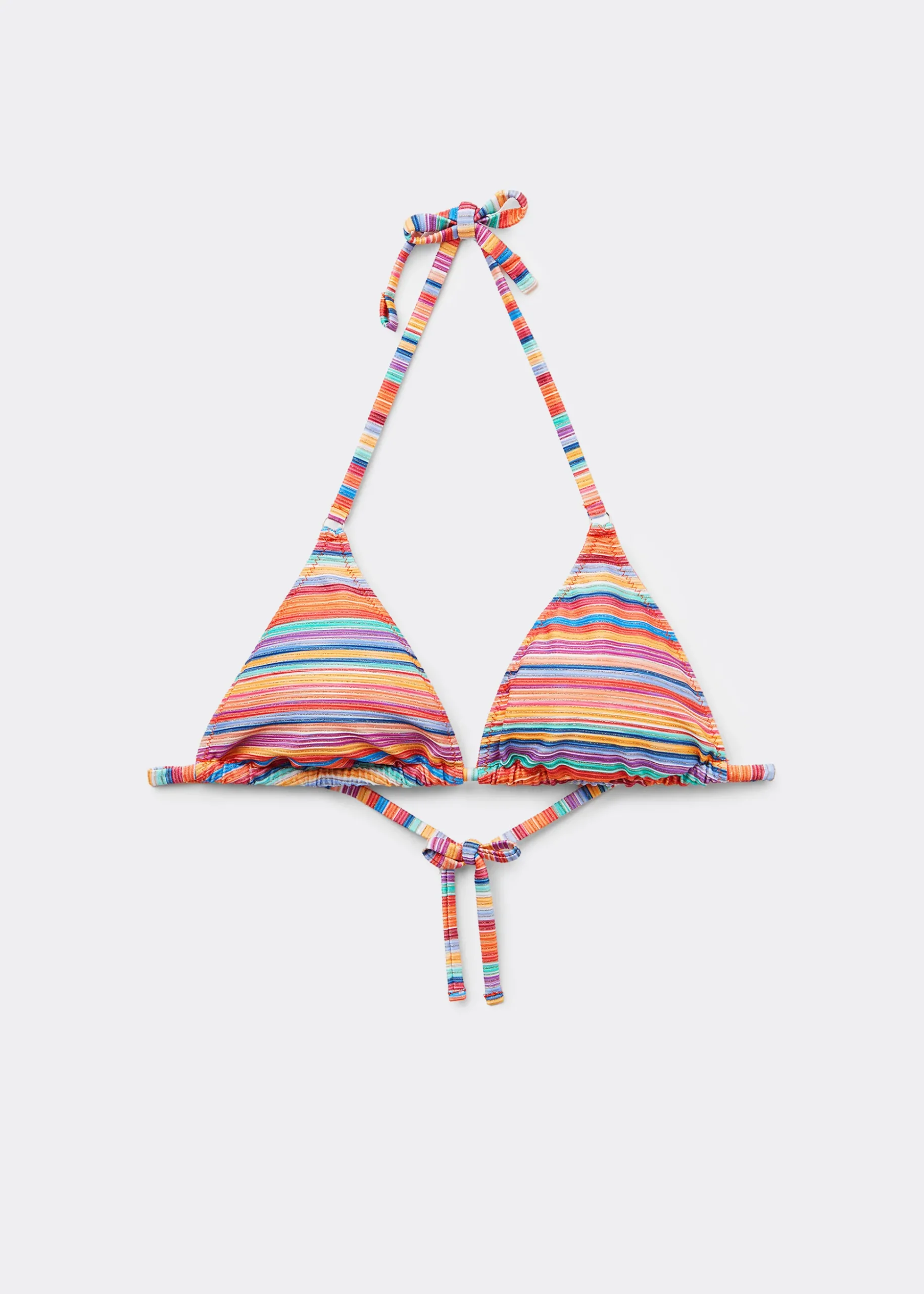 Góra od bikini z ruchomymi, trójkątnymi miseczkami i wyjmowanymi wkładkami. Bezfiszbinowy fason zapewnia naturalny efekt. Tkanina ze wzorem w jaskrawe kolorowe paseczki, wykończona błyszczącym brokatem, charakteryzuje się miękką w dotyku i dynamiczną fakturą, która tworzy nowoczesny efekt. Ramiączka można zawiązać na karku lub przymocować z tyłu dzięki pętelkom na końcówkach. Z tyłu wiązanie na cienkie troczki.