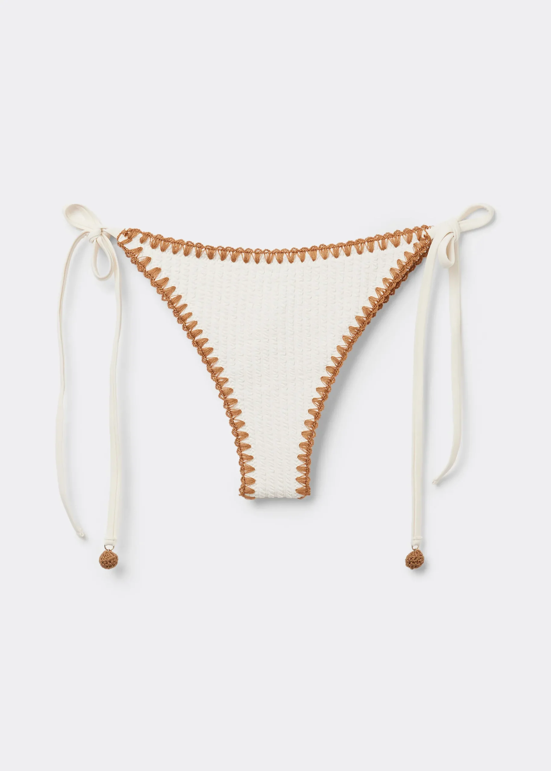Brazyliany od bikini wiązane w biodrach na troczki umożliwiające wygodne dopasowanie. Dzięki lekko zaokrąglonej talii z przodu można je nosić w klasyczny sposób lub odsłonić biodra, w zależności od sylwetki. Model wyróżnia się krepowaną tkaniną ozdobioną haftem w kontrastowym kolorze. W całości wykończone podszewką. Tył z marszczeniem i szwem pośrodku dla większej wygody noszenia.