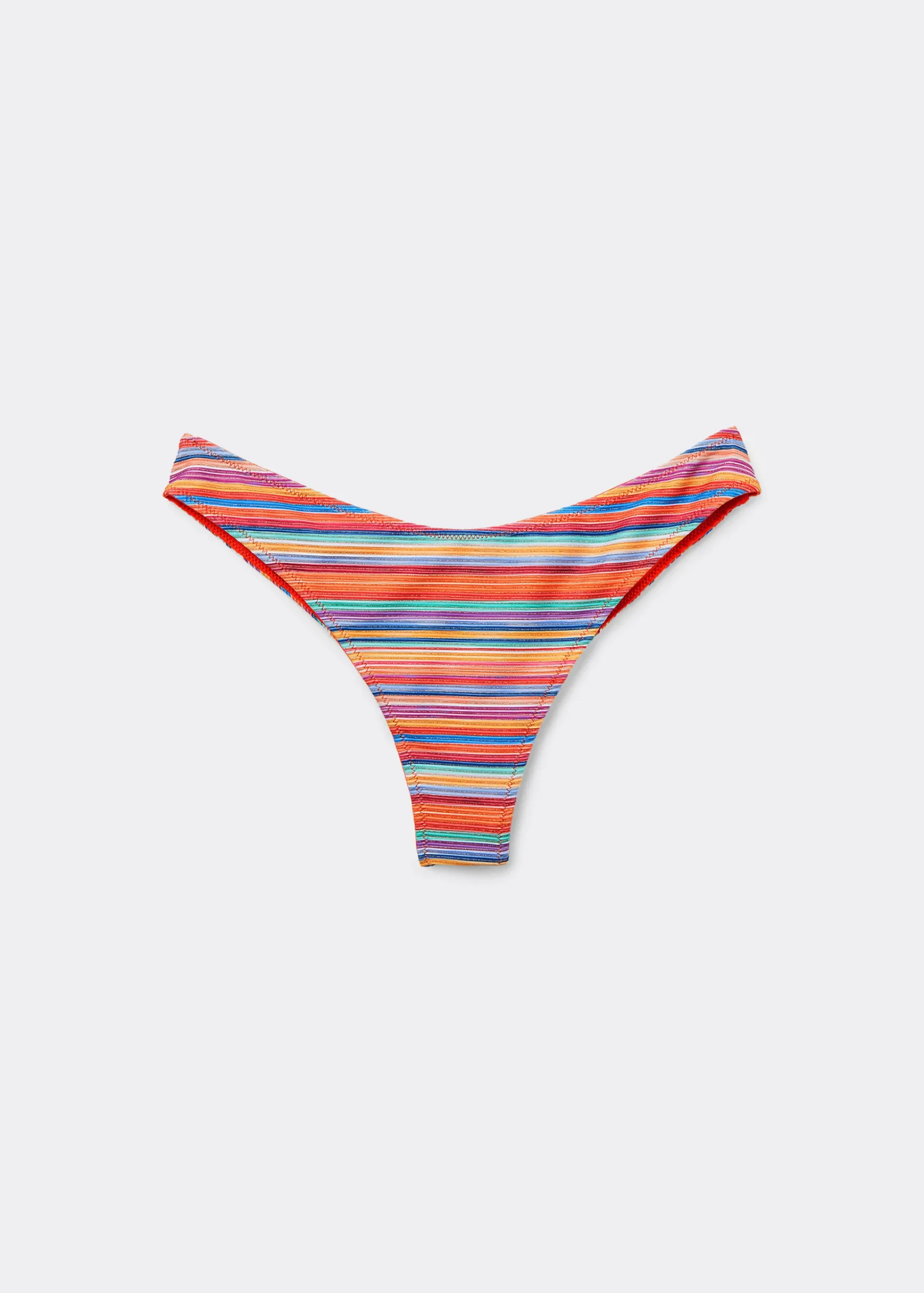 Brazyliany od bikini z niewidocznymi szwami. Dzięki lekko zaokrąglonej talii z przodu można je nosić w klasyczny sposób lub odsłonić biodra, w zależności od sylwetki. Tkanina ze wzorem w jaskrawe kolorowe paseczki, wykończona błyszczącym brokatem, charakteryzuje się miękką w dotyku i dynamiczną fakturą, która tworzy nowoczesny efekt.