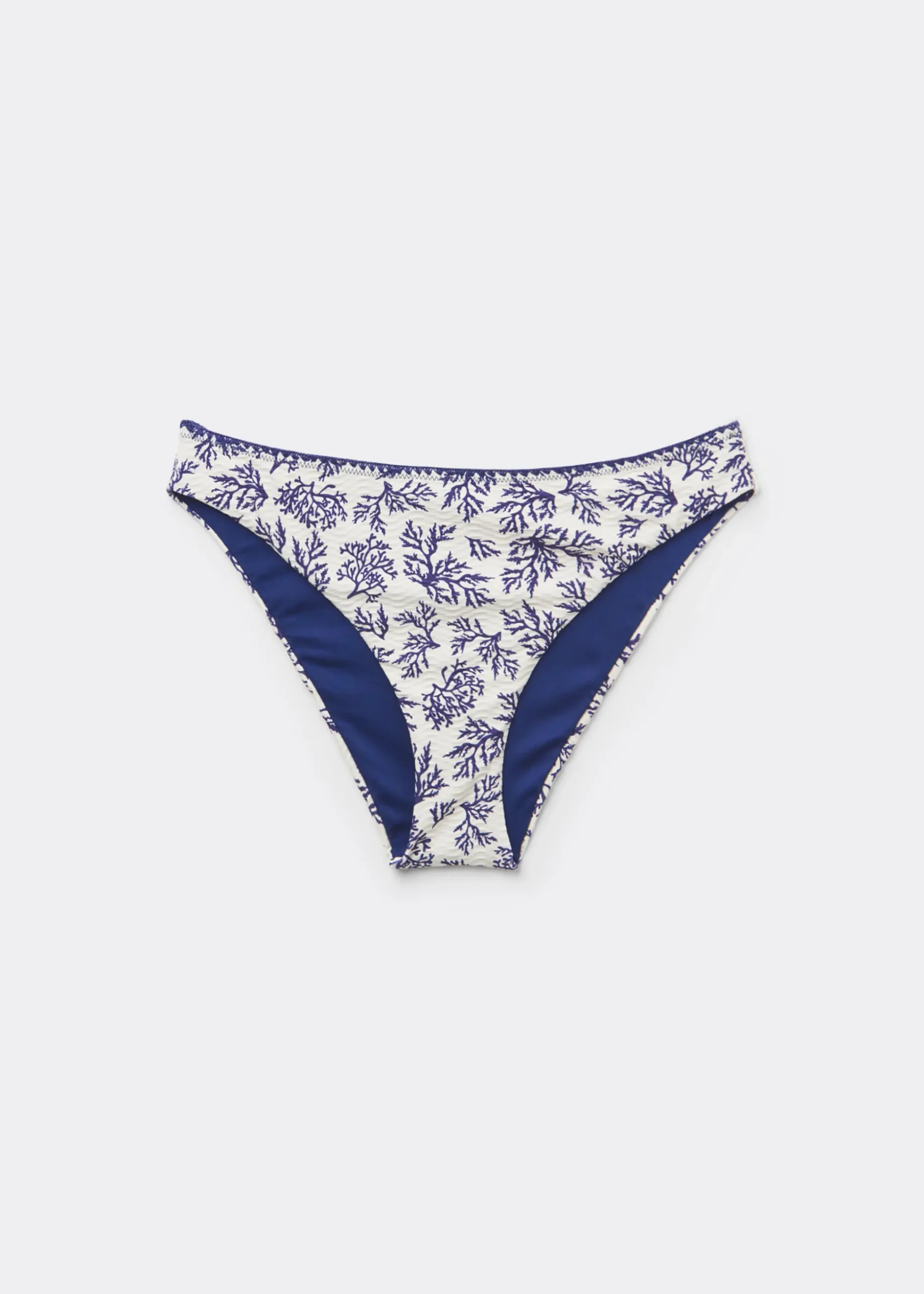 Figi od bikini w całości wykończone podszewką i niewidocznymi szwami zaprojektowanymi tak, aby nie wpijać się w ciało. Zaokrąglona talia z przodu pozwala nosić je w tradycyjny sposób lub odsłonić biodra, w zależności od sylwetki. Marynistyczny wzór z niebieskimi koralami na lekko falującej tkaninie tworzy świeży, wyrafinowany i dynamiczny efekt.