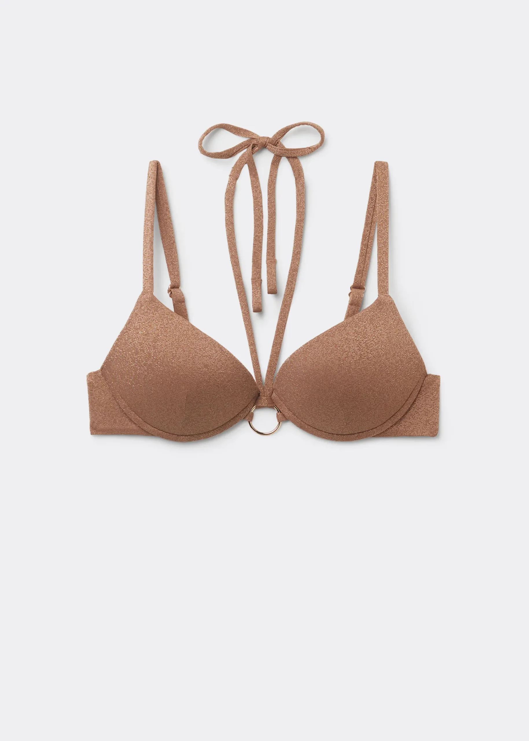 Góra od kostiumu z usztywnianymi miseczkami push-up na fiszbinach, ze stopniowanym wypełnieniem, które dodaje objętości. Miękka tkanina z błyszczącą metaliczną nitką, ozdobiona bezniklowymi kółkami w kolorze złotym. Regulowane ramiączka i zapięcie z tyłu na haczyk.