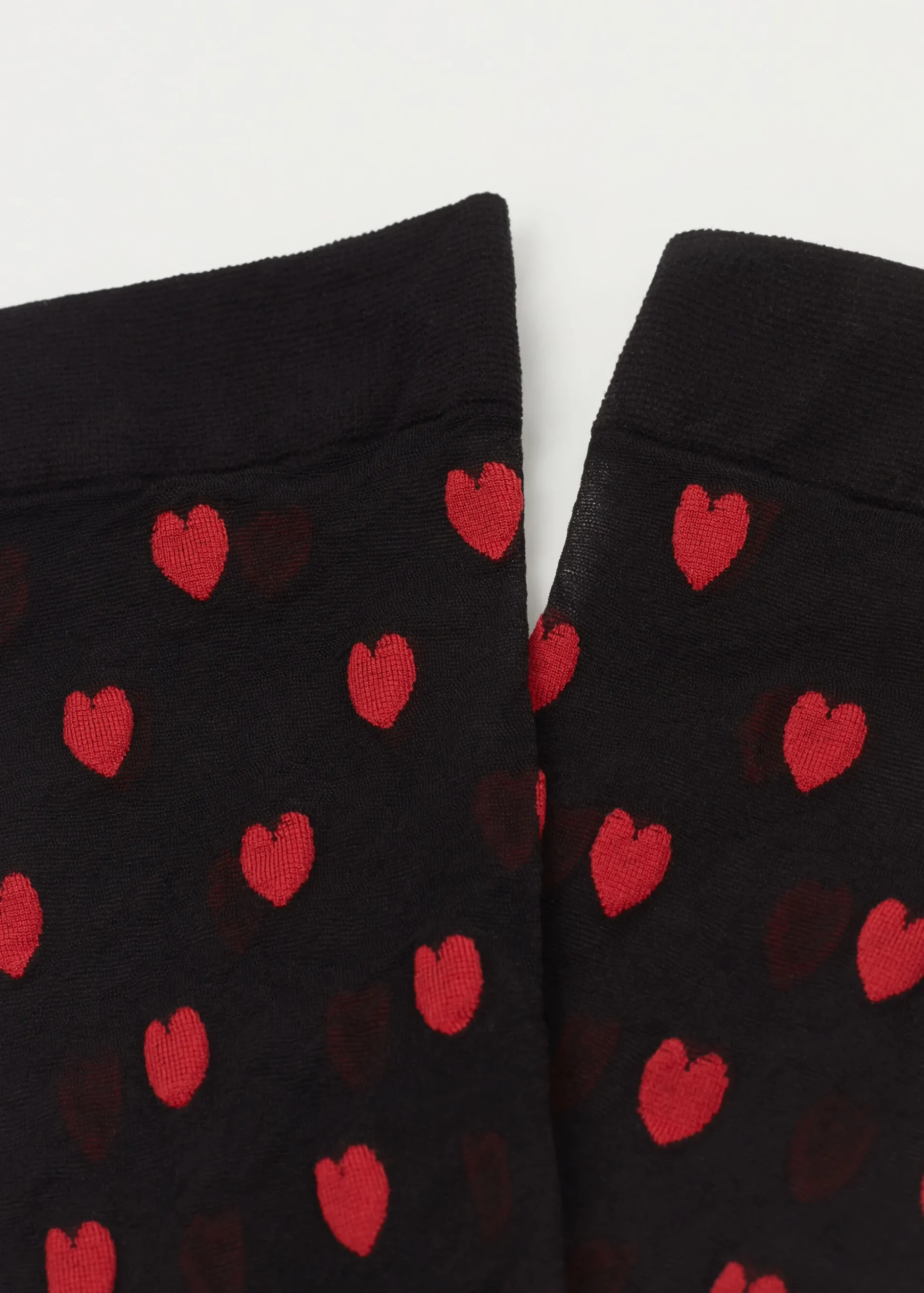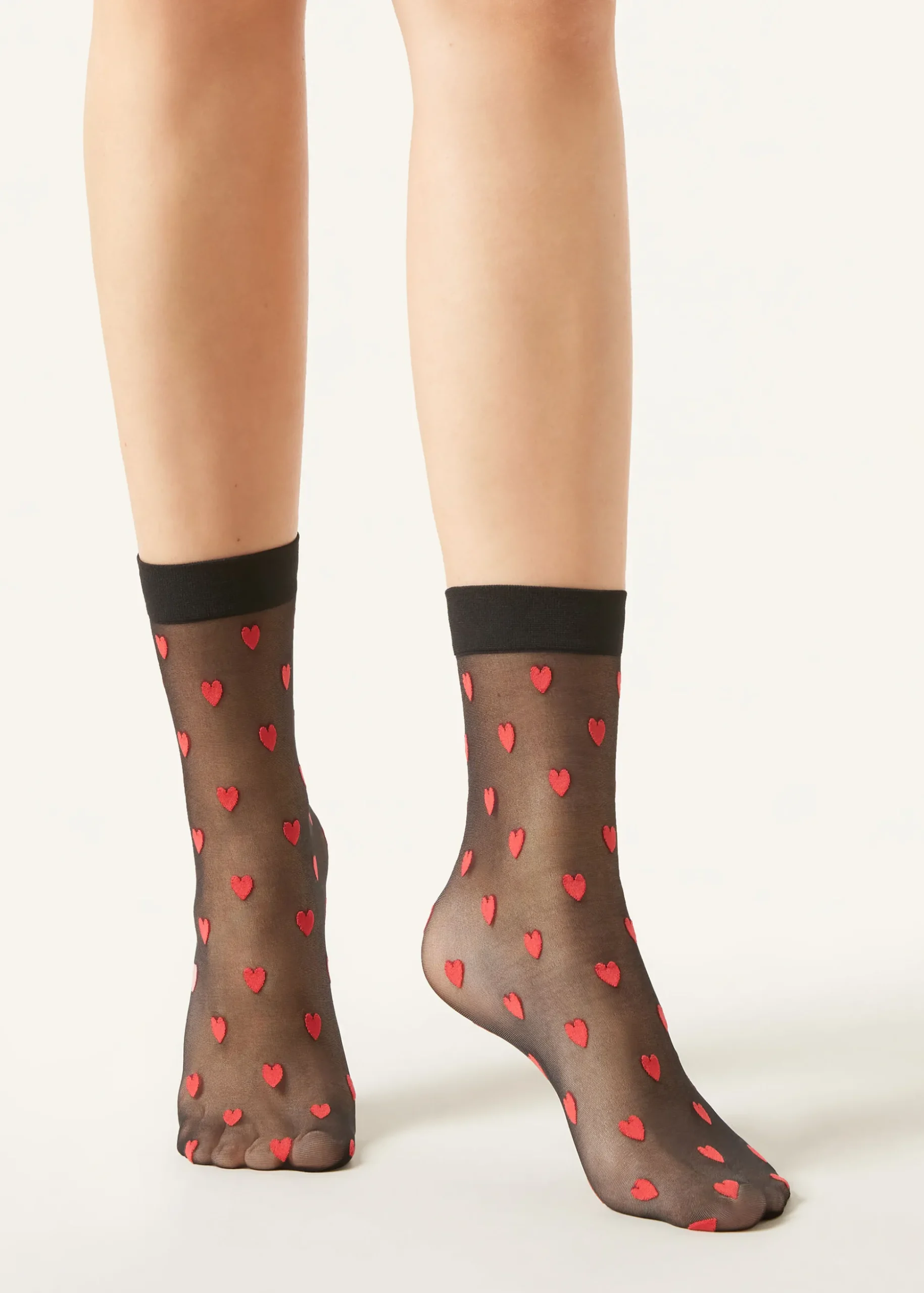 Krótkie cienkie skarpety damskie 15 den z kontrastowym wzorem w serduszka na całej powierzchni, wykończone gładkim ściągaczem.