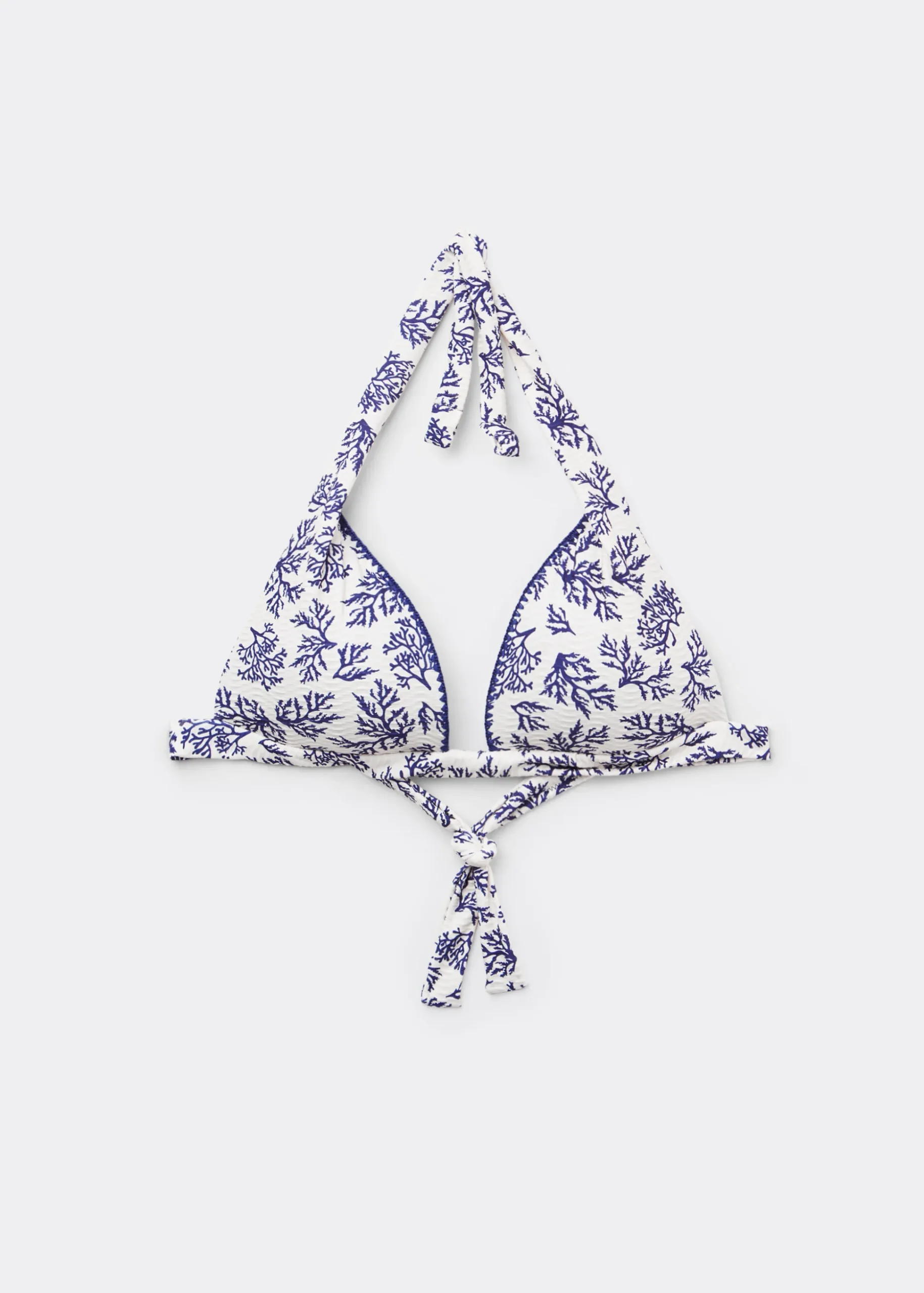 Góra od bikini z usztywnianymi nieruchomymi trójkątnymi miseczkami bez fiszbin, ze stopniowanym wypełnieniem, które zwiększa efekt objętości, podkreślając biust. Marynistyczny wzór z niebieskimi koralami na lekko falującej tkaninie tworzy świeży, wyrafinowany i dynamiczny efekt. Ramiączka można zawiązać na karku lub przymocować z tyłu dzięki pętelkom na końcówkach. Z tyłu wiązanie na kokardę.