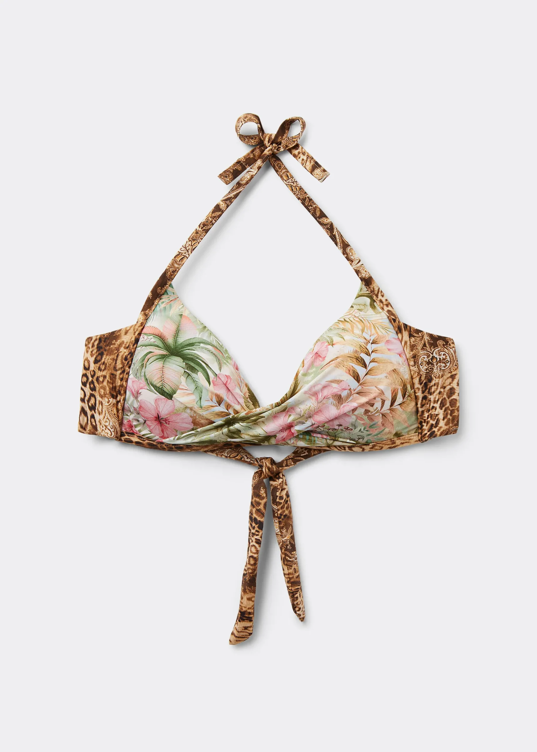 Góra od bikini z usztywnianymi nieruchomymi trójkątnymi miseczkami bez fiszbin, ze stopniowanym wypełnieniem, które zwiększa efekt objętości. Krój na zakładkę podkreśla dekolt. Żywy wzór łączący w sobie delikatne, kolorowe, tropikalne motywy kwiatowe ze zwierzęcymi detalami. Z tyłu wiązanie na kokardę. W rozmiarze 90B miseczki są lekko usztywniane.