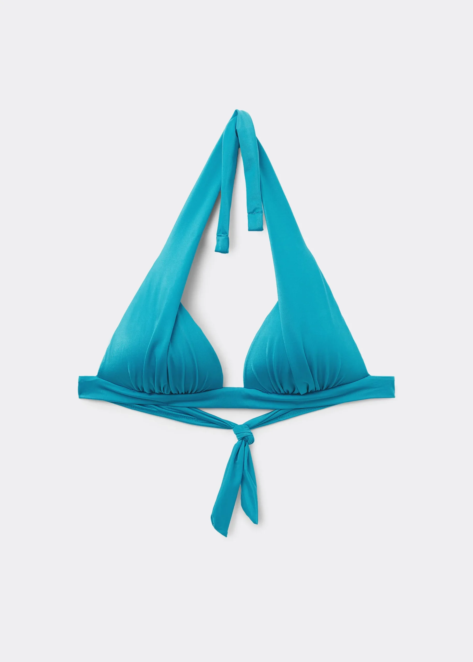 Góra od kostiumu z usztywnianymi nieruchomymi trójkątnymi miseczkami bez fiszbin, ze stopniowanym wypełnieniem, które zwiększa efekt objętości, podkreślając biust. Model wyróżnia się błyszczącą tkaniną z efektem jedwabiu, ozdobioną marszczeniami. Ramiączka można zawiązać na karku lub przymocować z tyłu dzięki pętelkom na końcówkach. Z tyłu wiązanie na kokardę.