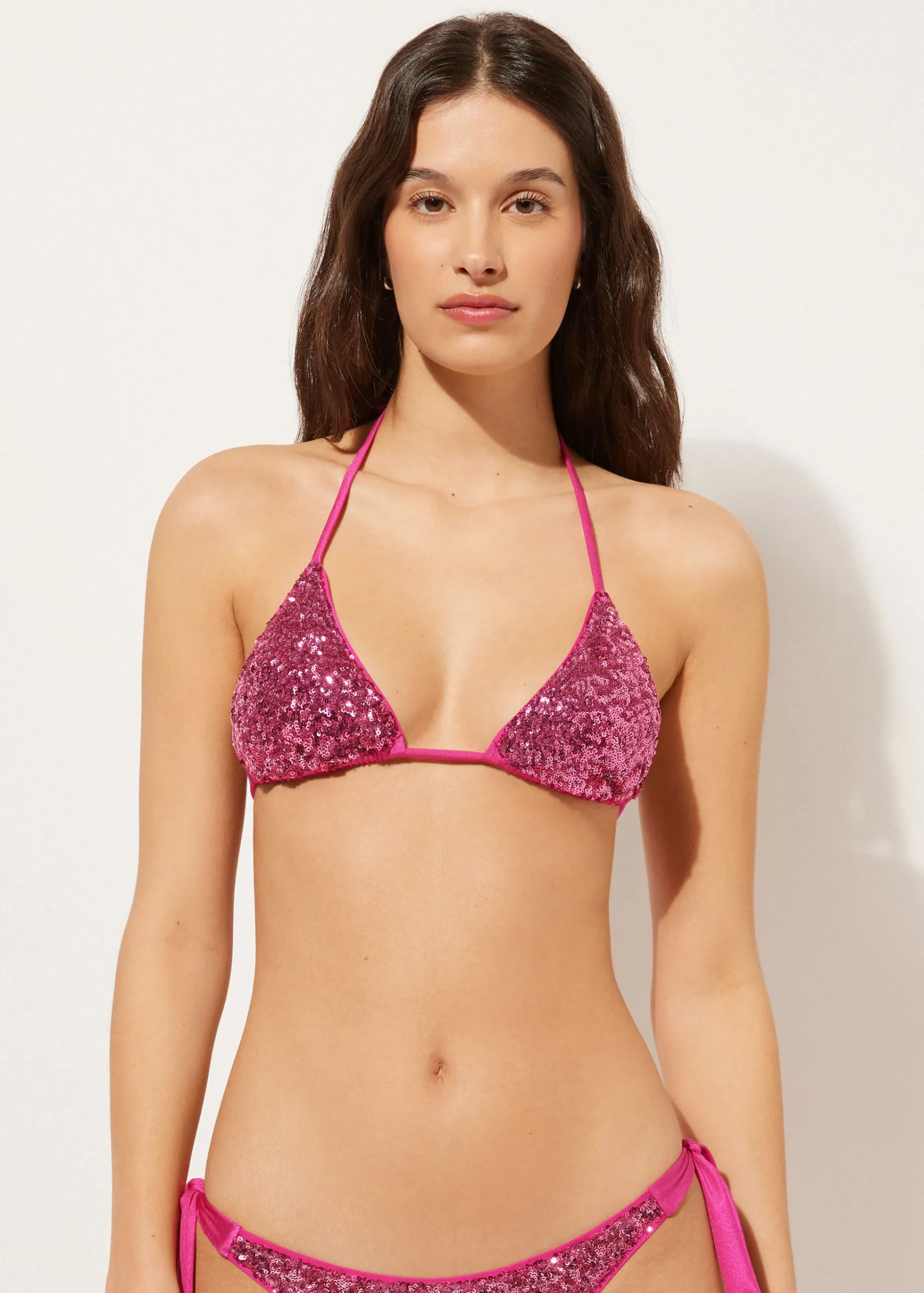 Góra od kostiumu z ruchomymi trójkątnymi miseczkami i wyjmowanymi wkładkami. Bezfiszbinowy fason zapewnia naturalny efekt. Tkanina z błyszczącej mikrofibry ozdobiona eleganckimi cekinami. Ramiączka można zawiązać na karku lub przymocować z tyłu dzięki pętelkom na końcówkach. Z tyłu wiązanie na cienkie troczki.