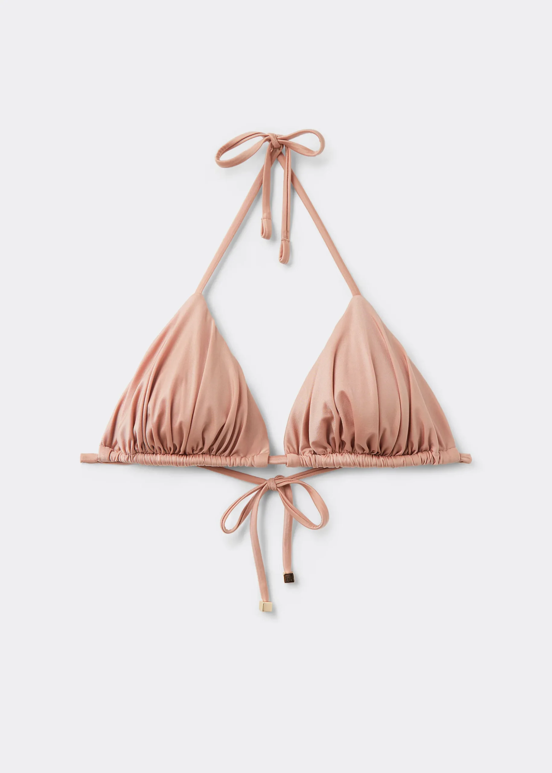 Bezfiszbinowa góra od kostiumu z trójkątnymi miseczkami z wyjmowanymi wkładkami. Model wyróżnia się błyszczącą tkaniną z efektem jedwabiu, ozdobioną marszczeniami i złotymi końcówkami. Ramiączka można zawiązać na karku lub przymocować z tyłu dzięki pętelkom na końcówkach. Z tyłu wiązanie na cienkie troczki.